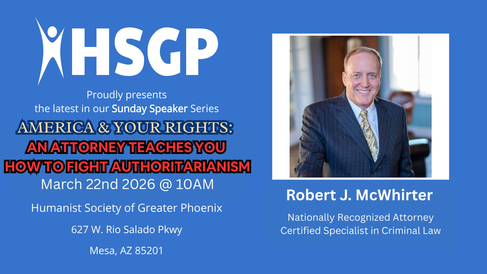 The Humanist Society of Greater Phoenix presents its Sunday Speaker meetings twice a month on Sunday mornings. Meetings are free and open to the public.