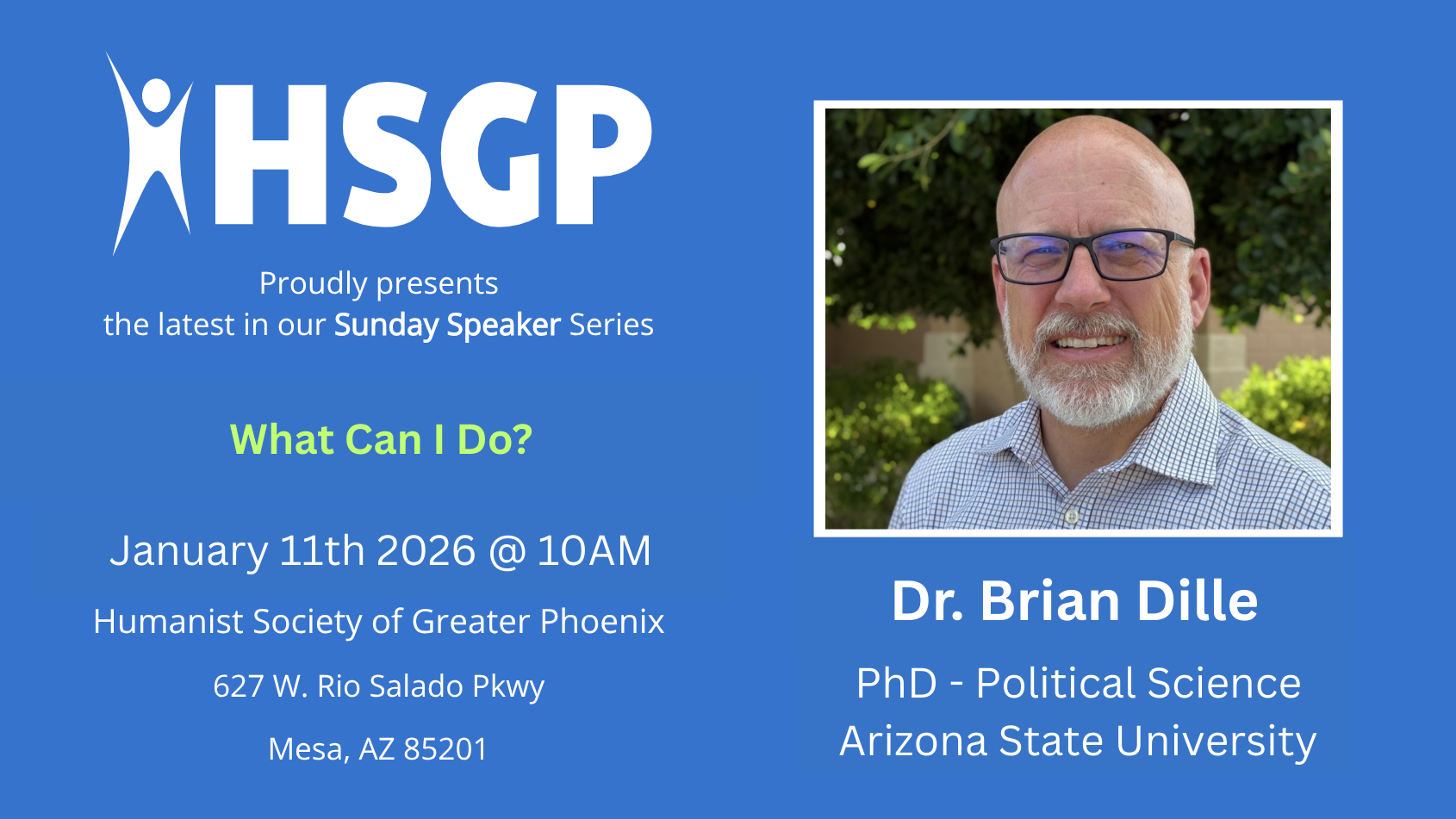 The Humanist Society of Greater Phoenix presents its Sunday Speaker meetings twice a month on Sunday mornings. Meetings are free and open to the public.